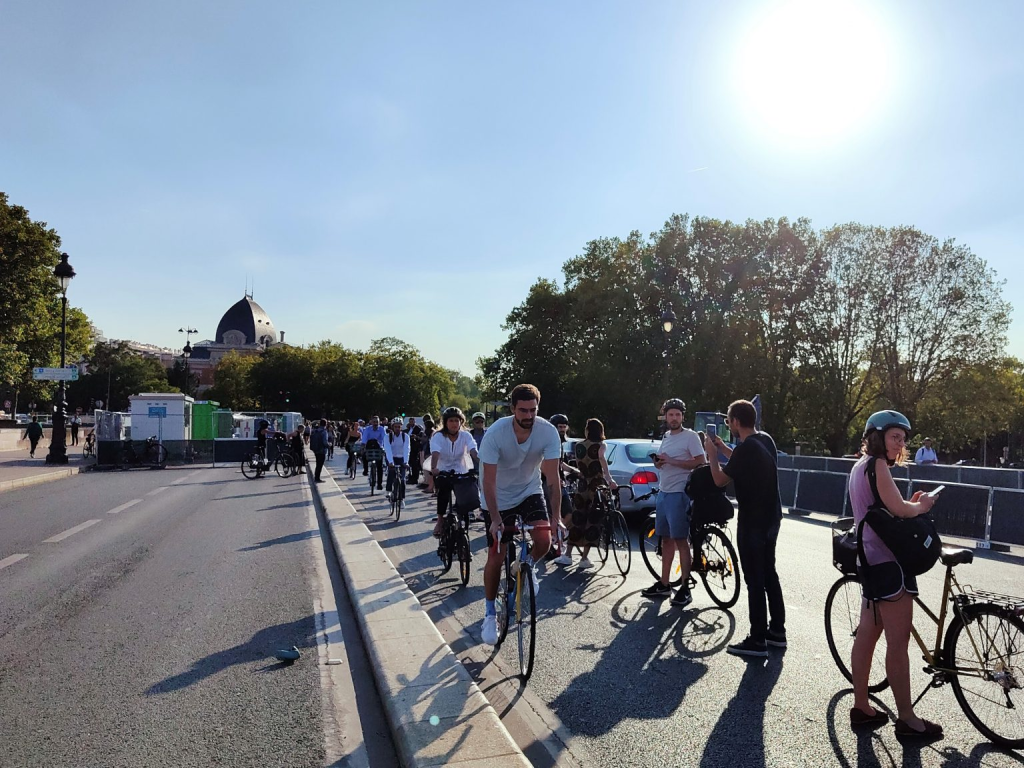 En 2022 : Une chaîne humaine pour protéger les cyclistes qui traversent le pont d’Austerlitz.