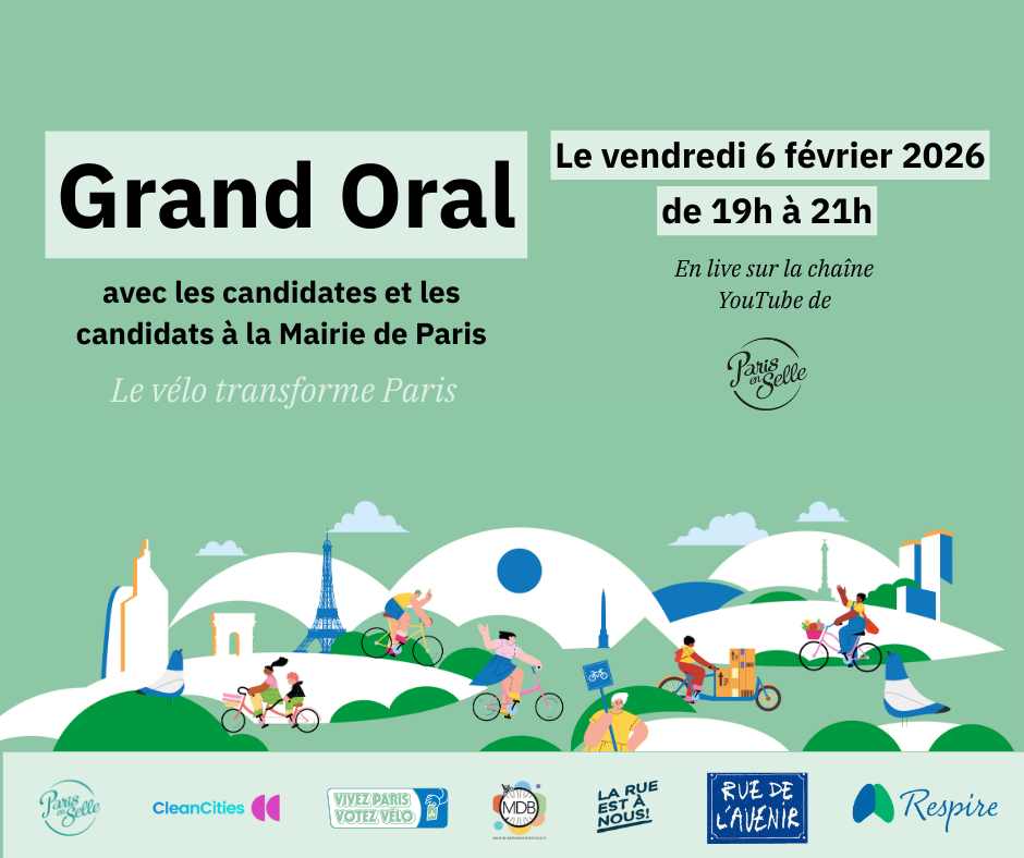 A l’occasion des élections municipales 2026, Paris en Selle organise un Grand Oral sur le thème “Le vélo transforme Paris” avec les candidates et candidats à la mairie de Paris.