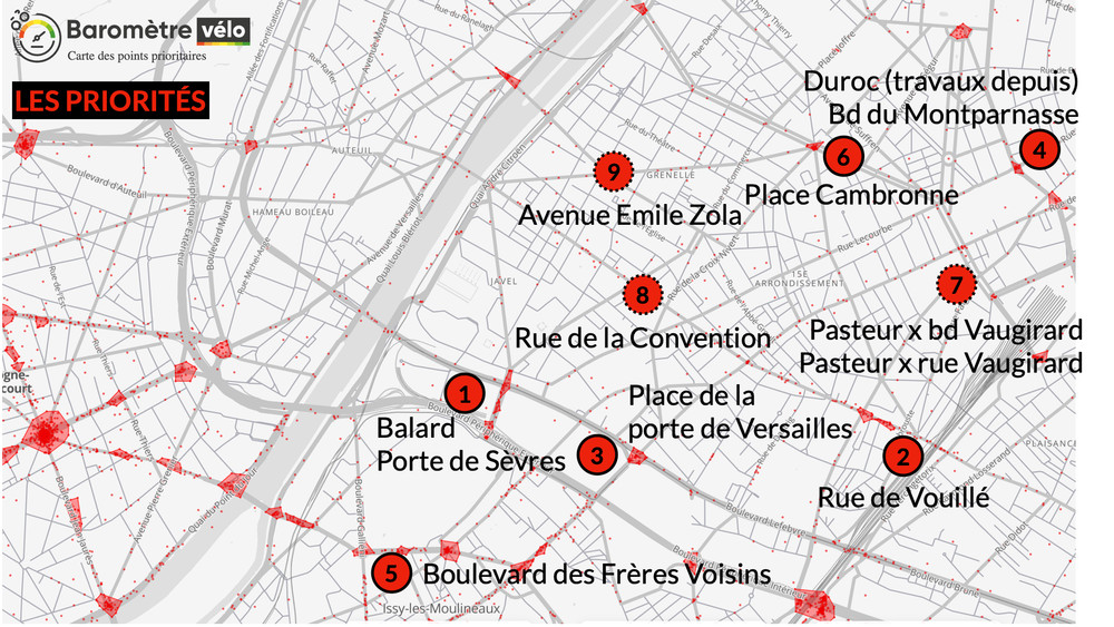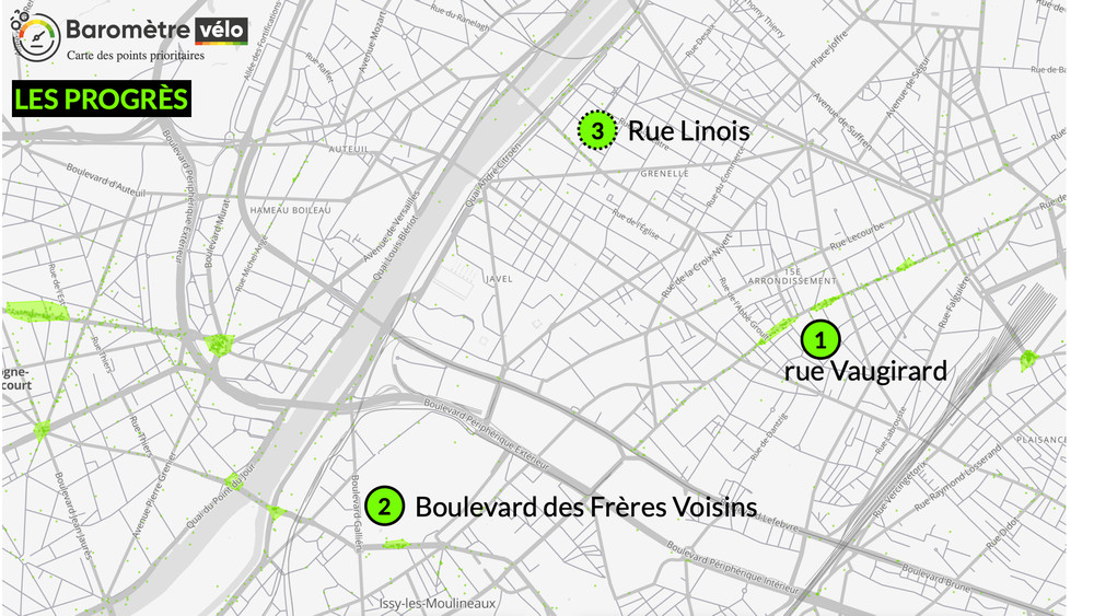 Le feu sur St Charles à l’angle de la rue du docteur Finlay tourne depuis 2 ans mais aucune signalisation verticale (M9v2) ou horizontale (marquages au sol) entre Grenelle et cette intersection. JY Pinet confirme qu’il y avait des travaux mais Yves indique qu’ils sont enfin finis (depuis plus de 6 mois).