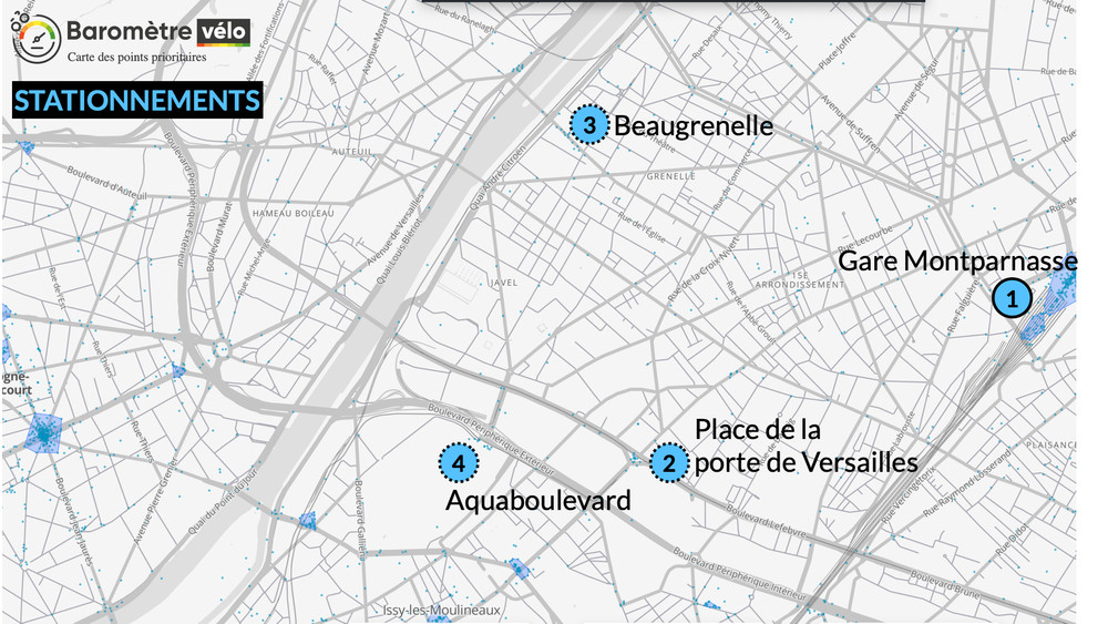 Les rues Desnouettes et du Hameau n’ont pas encore de double sens cyclable (et le stationnement en épi dans la rue du Hameau est d’un autre temps).