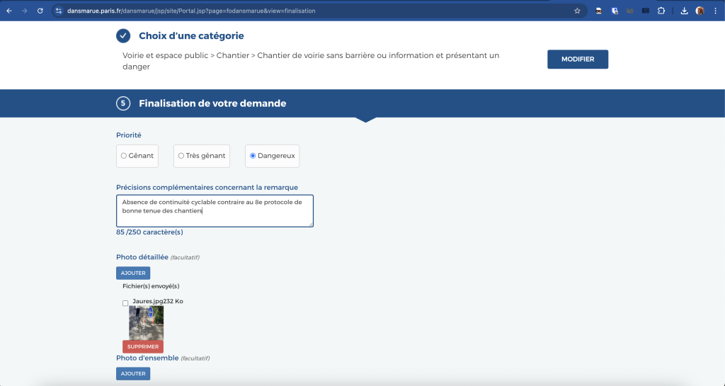 - mais aussi de signaler sur Dans Ma Rue un problème avec la référence du chantier déjà sélectionnée.