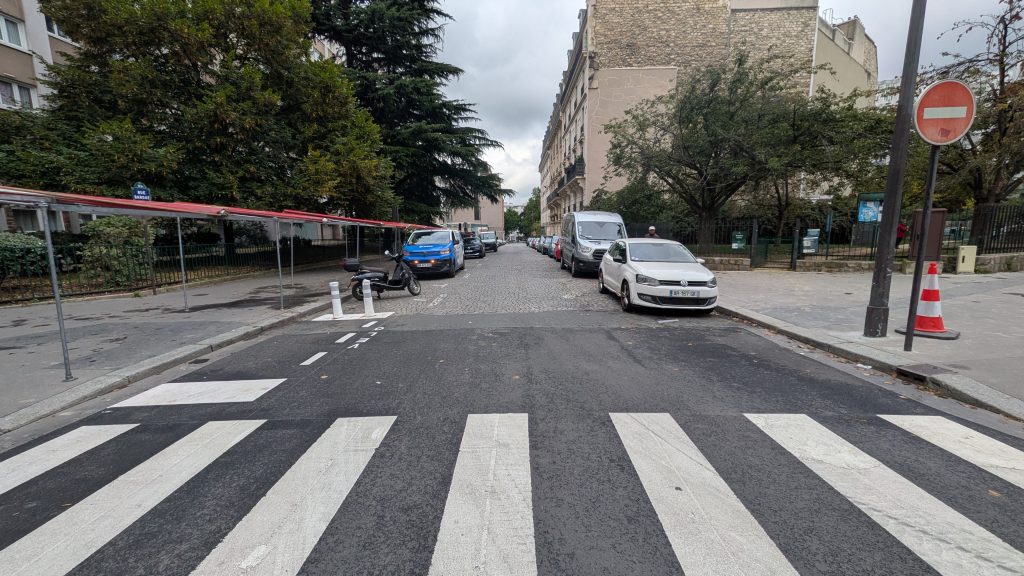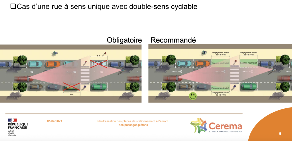 - le périmètre : la doctrine parisienne sur l’application de la LOM reste floue à l’heure actuelle. On voit en effet parfois une application des recommandations du Cerema en neutralisant les places des deux côtés en amont des passages piétons dans le sens des motorisés dans le cas d’une rue à sens unique avec double sens cyclable. Et parfois pas…