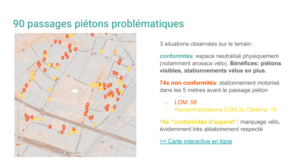 2. On peut aussi mener un exercice de relevé des passages à traiter pour faire ouvrir les yeux aux élus sur l’ampleur de la tâche à réaliser pour pousser la mise en place d’un programme de mise en conformité dédié. Voici ce que cela donnait en mai 2025 pour un des 10 quartiers du 15e arrondissement :